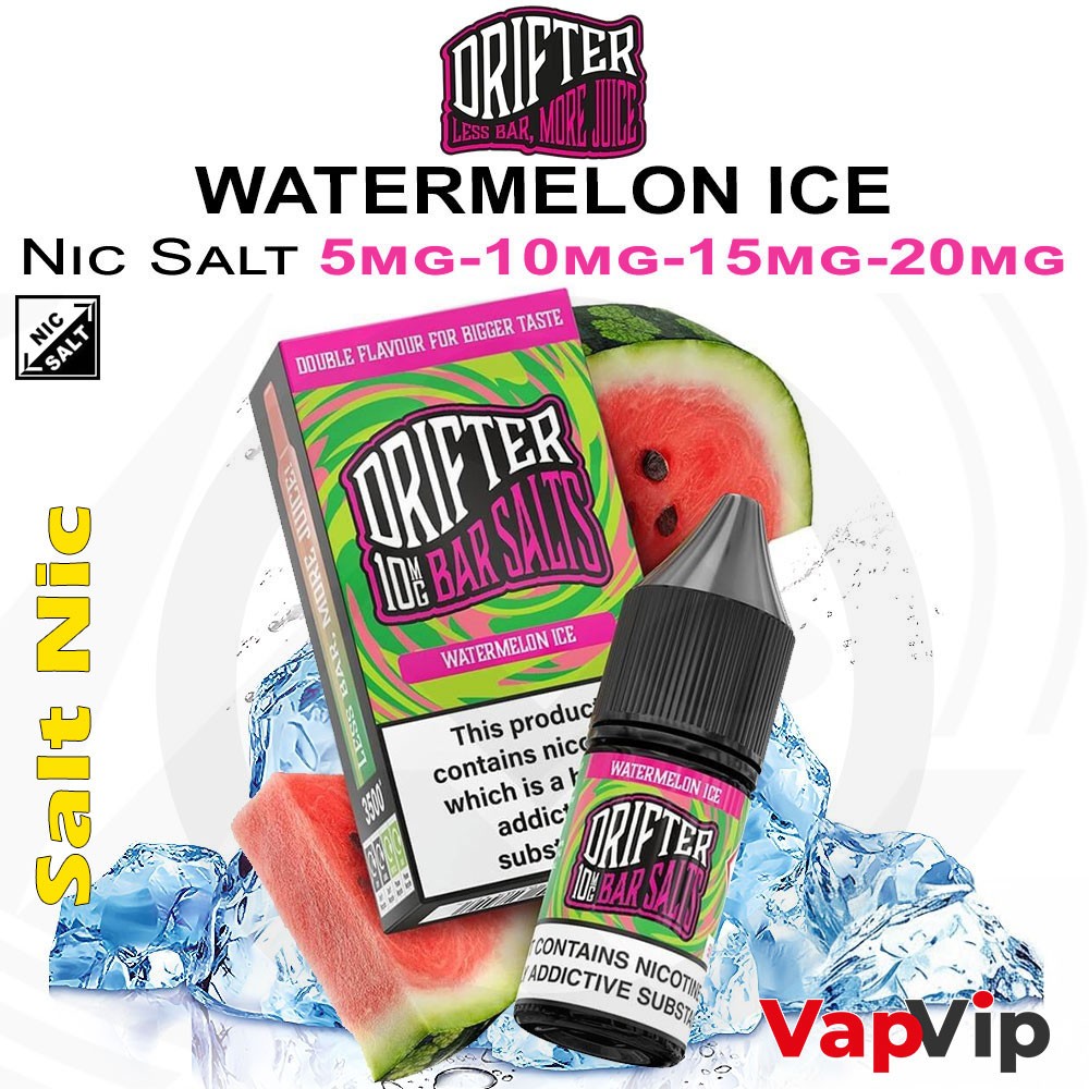WATERMELON ICE Sales de Nicotina by Drifter Bar SaltsWatermelon Ice Nic Salt de Drifter Bar Juice combina la dulzura de la sandía jugosa con un refrescante final helado, creando una experiencia de sabor que es a la vez dulce y refrescante. Cada inhalación te envuelve en la esencia de la sandía madura, complementada con un toque de frescura. Disfruta del potente sabor de los vaper desechables siendo más responsable con el medio ambiente y con un precio excepcional. La mezcla 50PG/50VG asegura una experiencia de vapeo suave y gratificante.