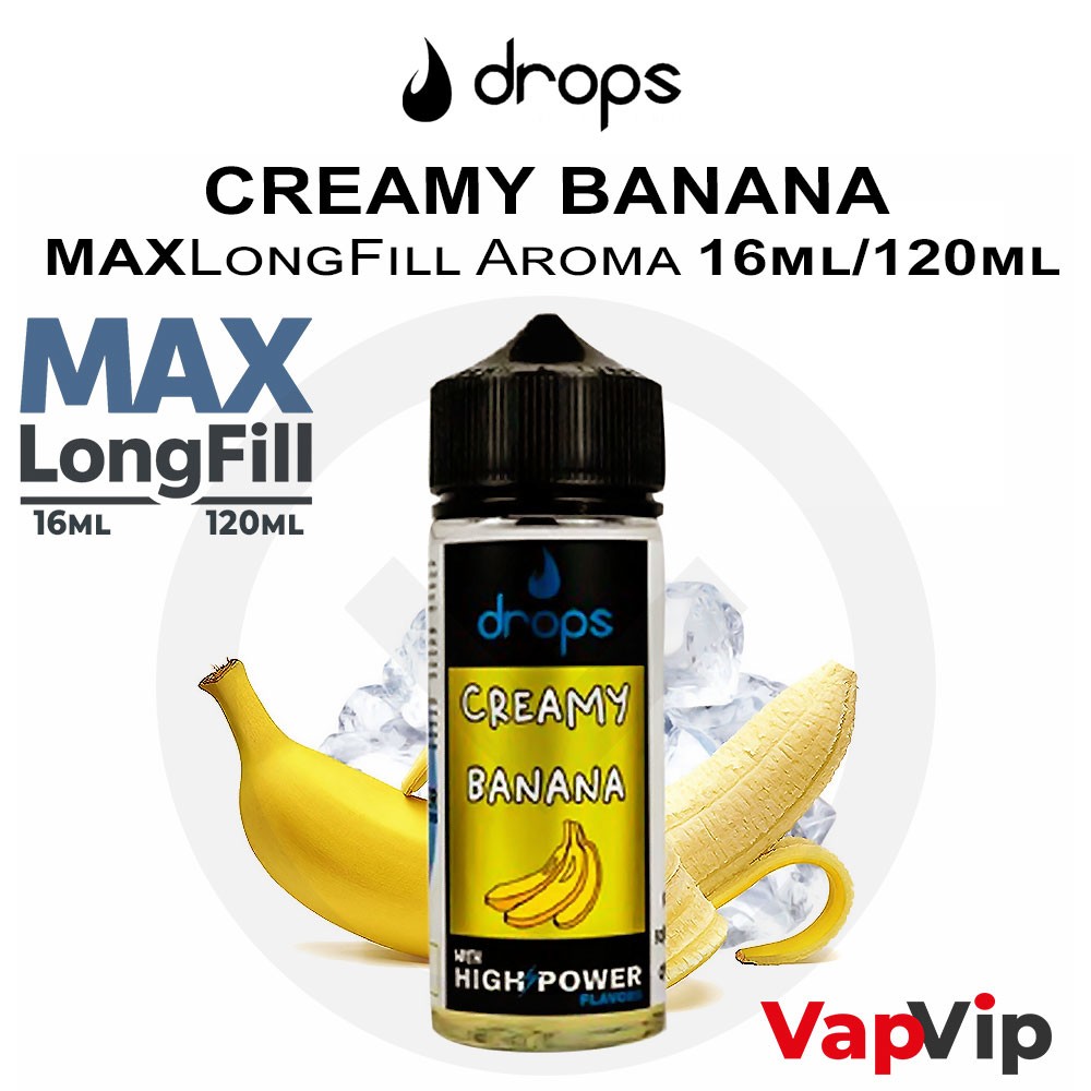 | CREAMY BANANA MAX-LongFill Aroma 16/120ml by Drops:Creamy Banana MAX-LongFill 16/120ml - Drops [High Power Flavor Series] ofrece el sabor cremoso y dulce del plátano canario, combinado con un toque de hielo picado que aporta una frescura suave y equilibrada. Déjate envolver por la dulzura más cremosa del Caribe.