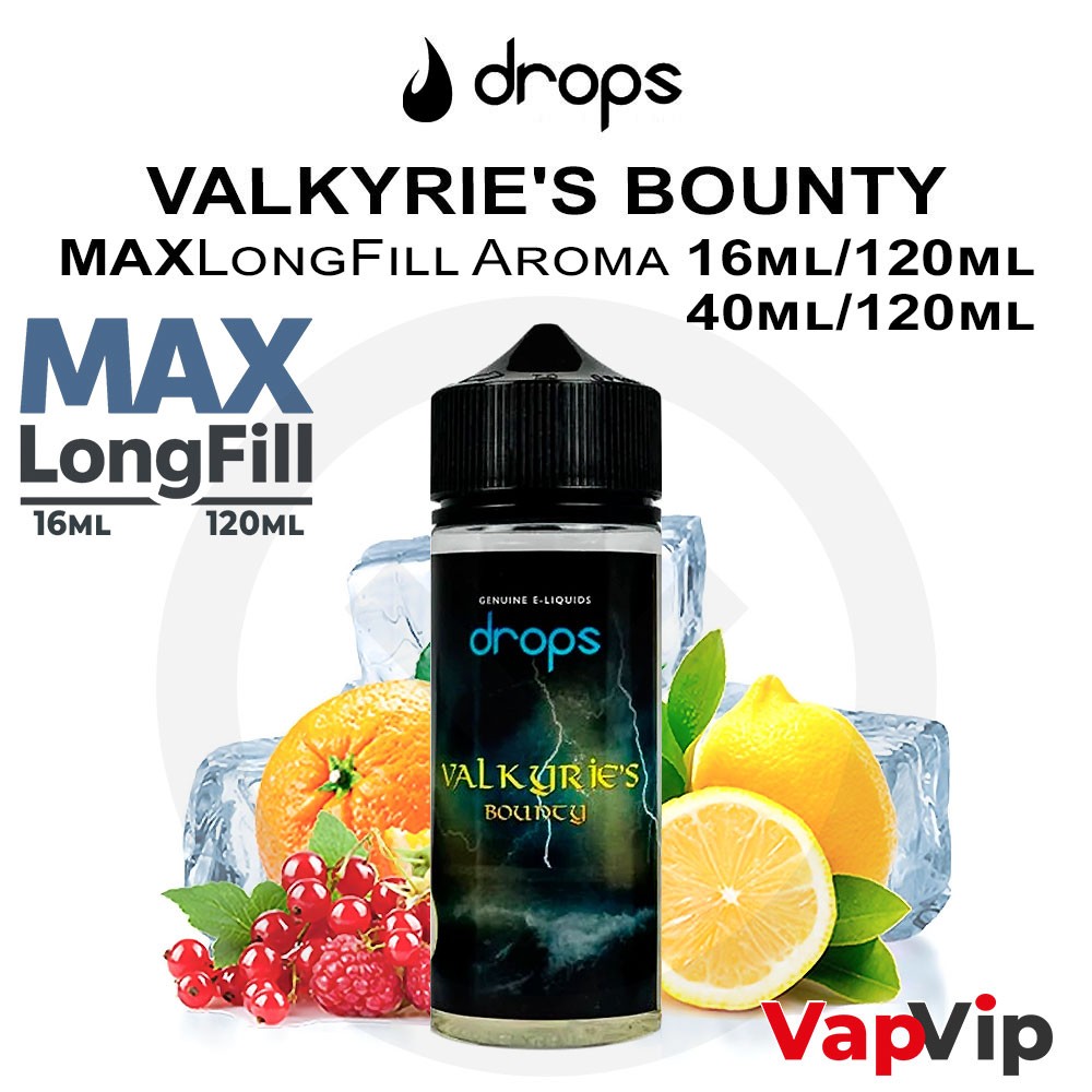 Drops Valkyries Bounty LongFill Aroma, una mezcla de frutos rojos, cítricos y frescor, ideal para un vapeo estimulante y refrescante.