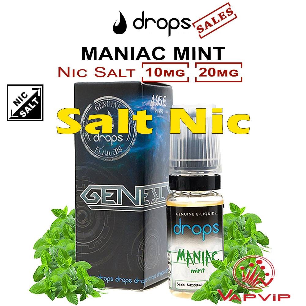 MANIAC MINT Sales de nicotina de DROPS Botella de 10ml de PET, obturador cuentagotas, tapón con evidencia de manipulación y cierre a prueba de niños (según la ISO 8317).