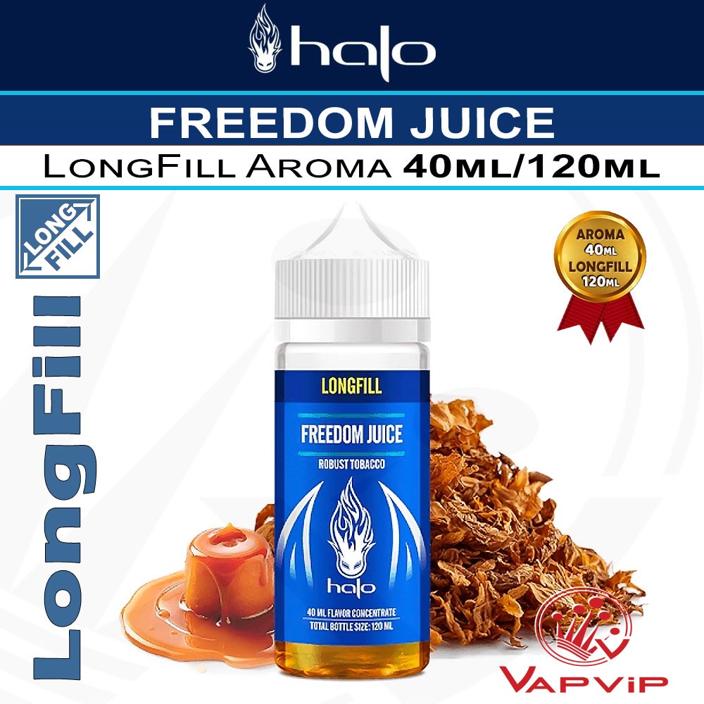 FREEDOM JUICE LongFill Aroma de Halo, una mezcla de tabaco Virginia y caramelo de toffee, ideal para quienes buscan una combinación clásica con un toque dulce.