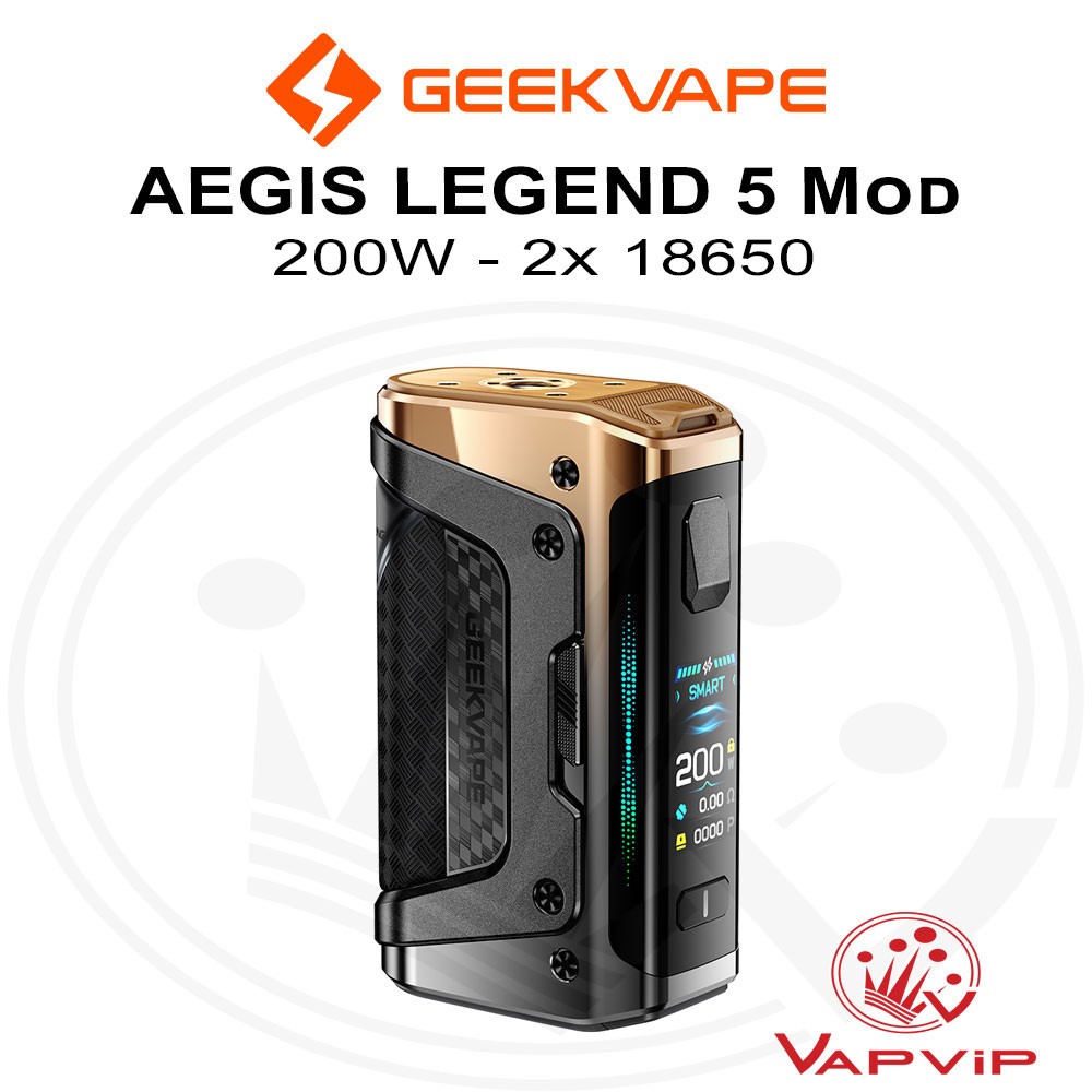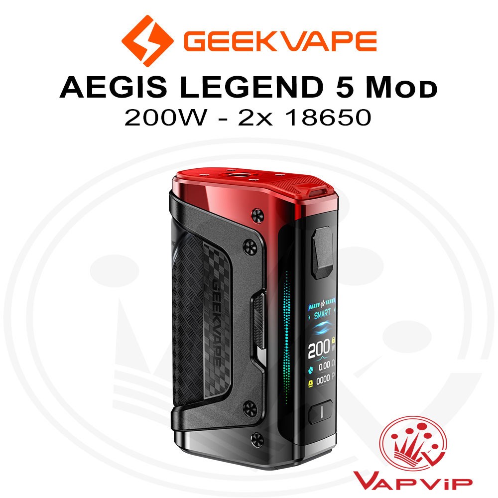 Aegis Legend 5 200W ModEl nuevo Geekvape Aegis Legend 5 es un mod doble 18650 con hasta 200W de potencia, resistencia IP68, pantalla TFT curva de 1.08” y un chip AS 4.0 ultrarrápido con modo Smart, Boost, Eco, TC y Custom. Diseñado para los entornos más exigentes y los vapeadores que lo quieren todo: estilo, rendimiento y fiabilidad total.