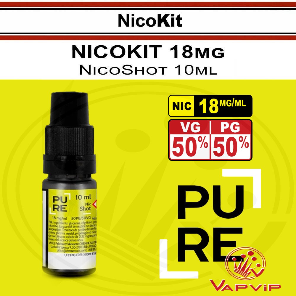 |  NicoKit: PURE Chemnovatic 10ml 18mg/ml en España:NicoKit con 18mg de nicotina para añadir nicotina a tu base o líquido Booster. PURE Chemnovatic, disponible para comprar en tu tienda de vapeo de España. |
