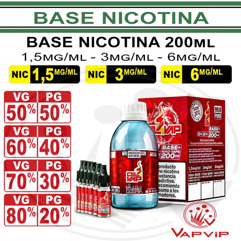 | Base 200 ml con nicotina by Oil4VapExperimenta la versatilidad de la Base 200 ml con nicotina por Oil4Vap. Selecciona entre proporciones como 50VG/50PG, 60VG/40PG, 70VG/30PG o 80VG/20PG y disfruta de niveles de 1,5mg/ml, 3mg/ml o 6mg/ml de nicotina. Aprovecha ahora para comprar y mezclar tus e-líquidos con la mejor base para tu experiencia de vapeo.