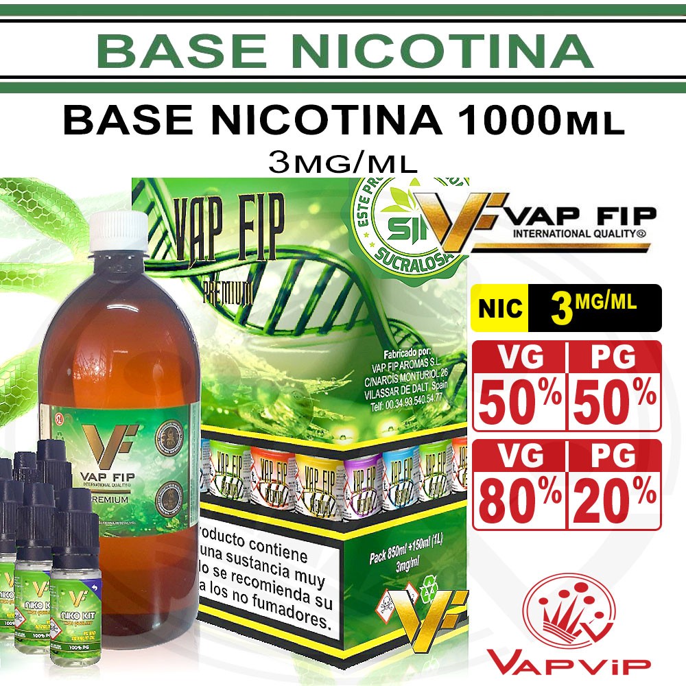 La Base Vap Fip de 1000 ml (1 litro) con nicotina es un líquido utilizado para la preparación de e-líquidos en cigarrillos electrónicos. Viene en una presentación de 1000ml y contiene 3mg/ml de nicotina.