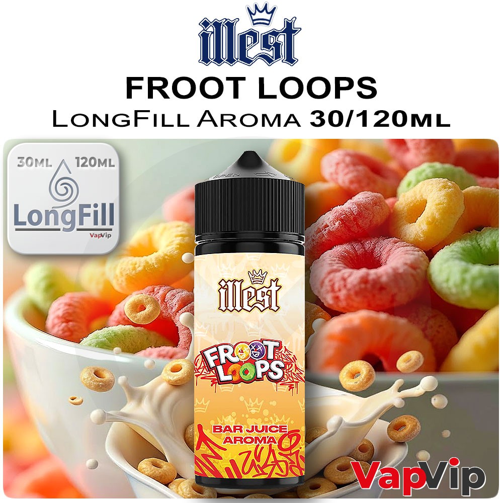 Illest FROOT LOOPS LongFill Flavor 30/120mlFROOT LOOPS by Illest perfectly recreates the flavour of iconic fruity cereals blended with sweet, creamy milk. Crunchy, colourful, and bursting with fruitiness, each puff brings the joyful taste of breakfast nostalgia to life.