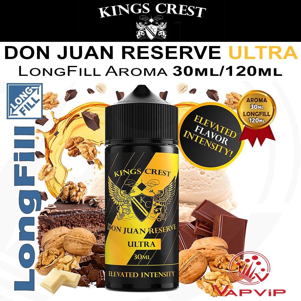DON JUAN RESERVE ULTRA LongFill Aroma 30/120ml by Kings Crest: The Don Juan Reserve ULTRA LongFill Aroma 30/120ml by Kings Crest takes the iconic Don Juan Reserve recipe to the next level, with even greater flavor intensity. Enjoy an exquisite chocolate cake topped with crunchy pecans and finished with a delicate coconut whipped cream, creating an even more immersive and delicious vaping experience. |