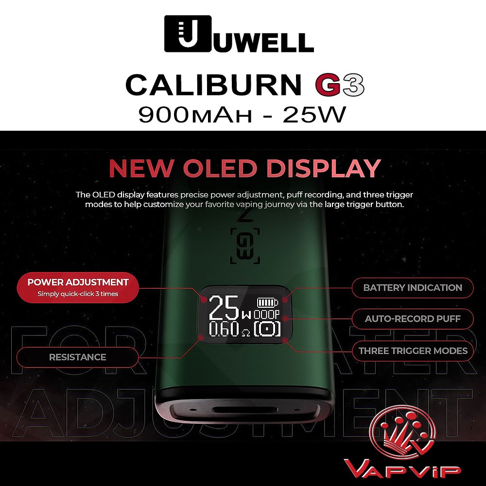 The OLED screen features precise power adjustment and puff recording to help customize your vaping experience through the button.